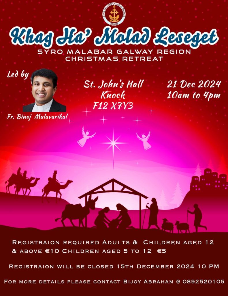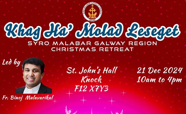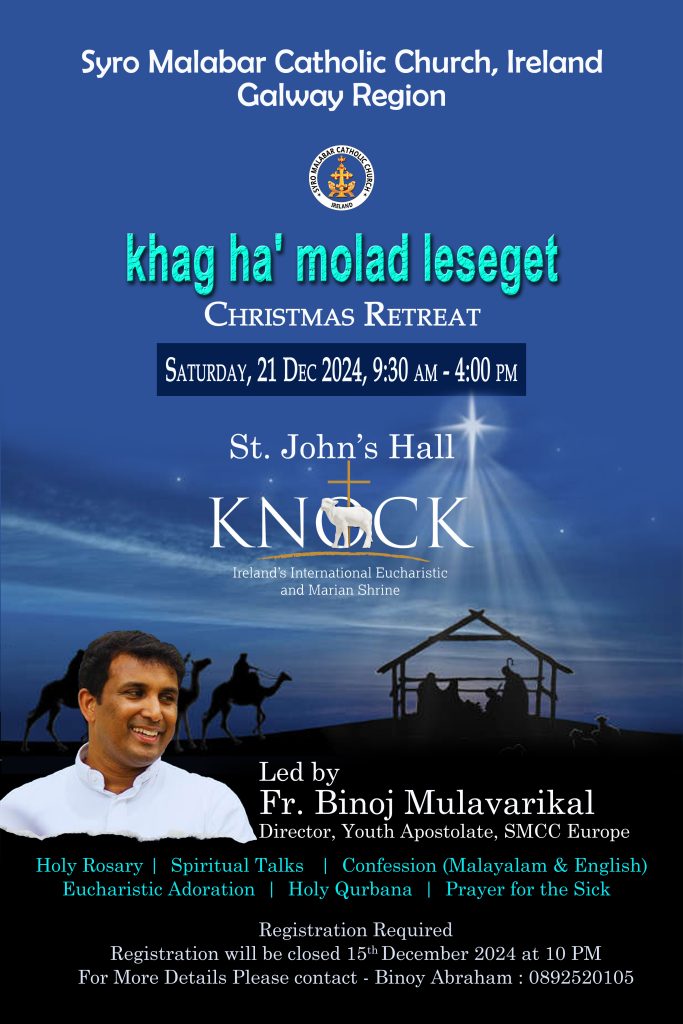 നോക്ക്, അയർലണ്ട് : ക്രിസ്തുമസിനു ഒരുക്കമായി അയർലണ്ട് സീറോ മലബാർ സഭയുടെ ഗാൽവേ റീജിയൺ സംഘടിപ്പിക്കുന്ന ഏകദിന ധ്യാനം നോക്ക് അന്താരാഷ്ട്ര ദിവ്യകാരുണ്യ മരിയൻ തീർത്ഥാടന കേന്ദ്രത്തിൽ നടക്കും. ഡിസംബർ 21 ശനിയാഴ്ച് നോക്ക് സെൻ്റ് ജോൺസ് ഹാളിൽ രാവിലെ 9:30 മുതൽ വൈകിട്ട് 4:30 വരെയാണ് ധ്യാനം ക്രമീകരിച്ചിരിക്കുന്നത്.