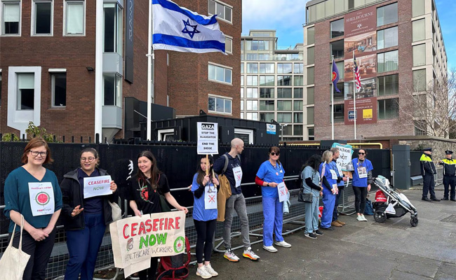 ഗാസയില് ജീവന് പണയം വച്ച് ജോലി ചെയ്യുന്ന പലസ്തീനി ഡോക്ടര്മാര്ക്കും, നഴ്സുമാര്ക്കും പിന്തുണയറിയിച്ച് ഡബ്ലിനിലെ ഇസ്രായേലി എംബസിക്ക് മുമ്പില് ആരോഗ്യപ്രവര്ത്തകരുടെ പ്രതിഷേധം. ഞായറാഴ്ച രാവിലെയാണ് ചെറിയൊരു സംഘം ആരോഗ്യപ്രവര്ത്തകര് ഇവിടെ പ്രതിഷേധം സംഘടിപ്പിച്ചത്.