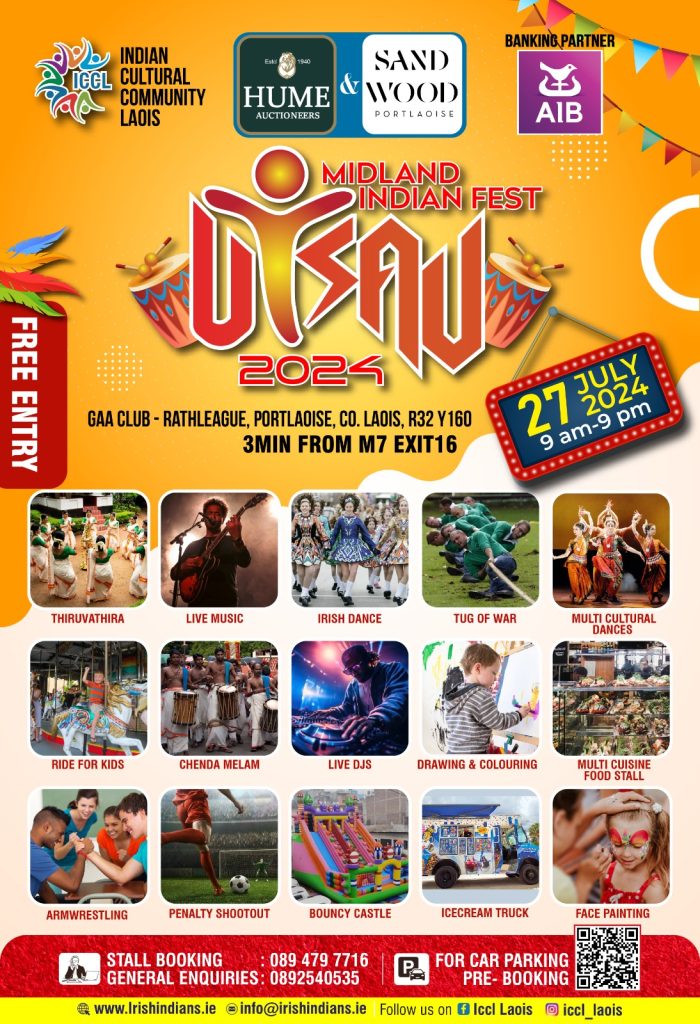 ഇന്ത്യൻ കൾചറൽ കമ്മ്യൂണിറ്റി ലീഷ് (ICCL) ആദ്യമായി സംഘടിപ്പിക്കുന്ന ‘Utsav 24’ എന്നു പേരിട്ടിരിക്കുന്ന ആഘോഷ പരിപാടികളുടെ തുടക്കം, കായിക മത്സരങ്ങൾക്ക് ഫ്ലാഗ് ഓഫ് ചെയ്തുകൊണ്ട് Portlaoise ഗാർഡ ഓഫീസർ നിർവഹിക്കുന്നതായിരിക്കും