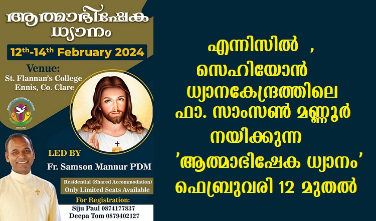 ഡബ്ലിന്: പ്രശസ്ത വചന പ്രഘോഷകനും അട്ടപ്പാടി സെഹിയോന് ധ്യാനകേന്ദ്രത്തിലെ വൈദികനുമായ ഫാ. സാംസണ് മണ്ണൂര് നയിക്കുന്ന റസിഡന്ഷ്യല് ധ്യാനം 2024 ഫെബ്രുവരി 12,13,14 (തിങ്കള്, ചൊവ്വ, ബുധന്) തീയതികളില് കൗണ്ടി ക്ലെയറിലെ St. Flannan’s College ല് വച്ചു നടത്തപ്പെടുന്നു.