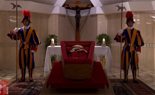 മാര്പ്പാപ്പയുടെ മൃതശരീരം സെന്റ് പീറ്റേഴ്സ് ബസിലിക്കയില് നാളെ 12.30 മുതല് പൊതുദര്ശനത്തിന് വയ്ക്കും. ശനിയാഴ്ച സെന്റ് പീറ്റേഴ്സ് സ്ക്വയറിലെ സംസ്കാരച്ചടങ്ങുകളില് കോളജ് ഓഫ് കര്ദിനാള്സിന്റെ ഡീന് കര്ദിനാള് ജിയോവന്നി ബാറ്റിസ്റ്റ റീ നേതൃത്വം വഹിക്കും.