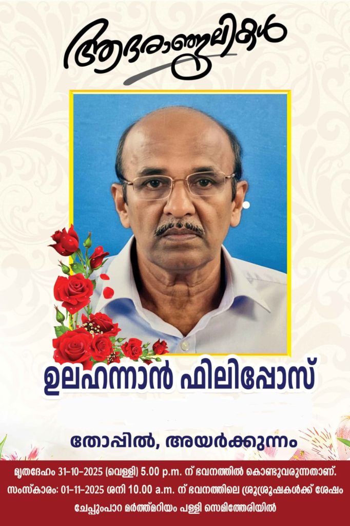 മൃതശരീരം ഇന്ന് (31-10-2025, വെള്ളിയാഴ്ച) വൈകിട്ട് 5 മണിക്ക് വസതിയിൽ കൊണ്ടുവരുന്നതാണ്.