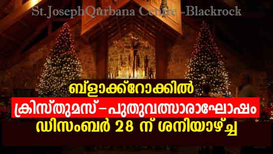 ഡബ്ലിന് സിറോ മലബാര് സഭ ബ്ലാക്ക്റോക്ക് സെയിന്റ് ജോസഫ് മാസ് സെന്റെർ ഇടവകയുടെ ക്രിസ്തുമസ് ന്യു ഇയർ ആഘോഷം ഡിസംബർ 28 ന് ശനിയാഴ്ച്ച നടക്കും .ശനിയാഴ്ച്ച ഉച്ച കഴിഞ്ഞ് 3 മണിമുതൽ രാത്രി 9 മണിവരെ ബ്ലാക്ക്റോക്കിലെ യാണ് ക്രിസ്തുമസ് & ന്യു ഇയർ ആഘോഷം St. Andrew’s Presbyterian Church ഹാളിൽ ആണ് പരിപാടികൾ നടക്കുന്നത് .