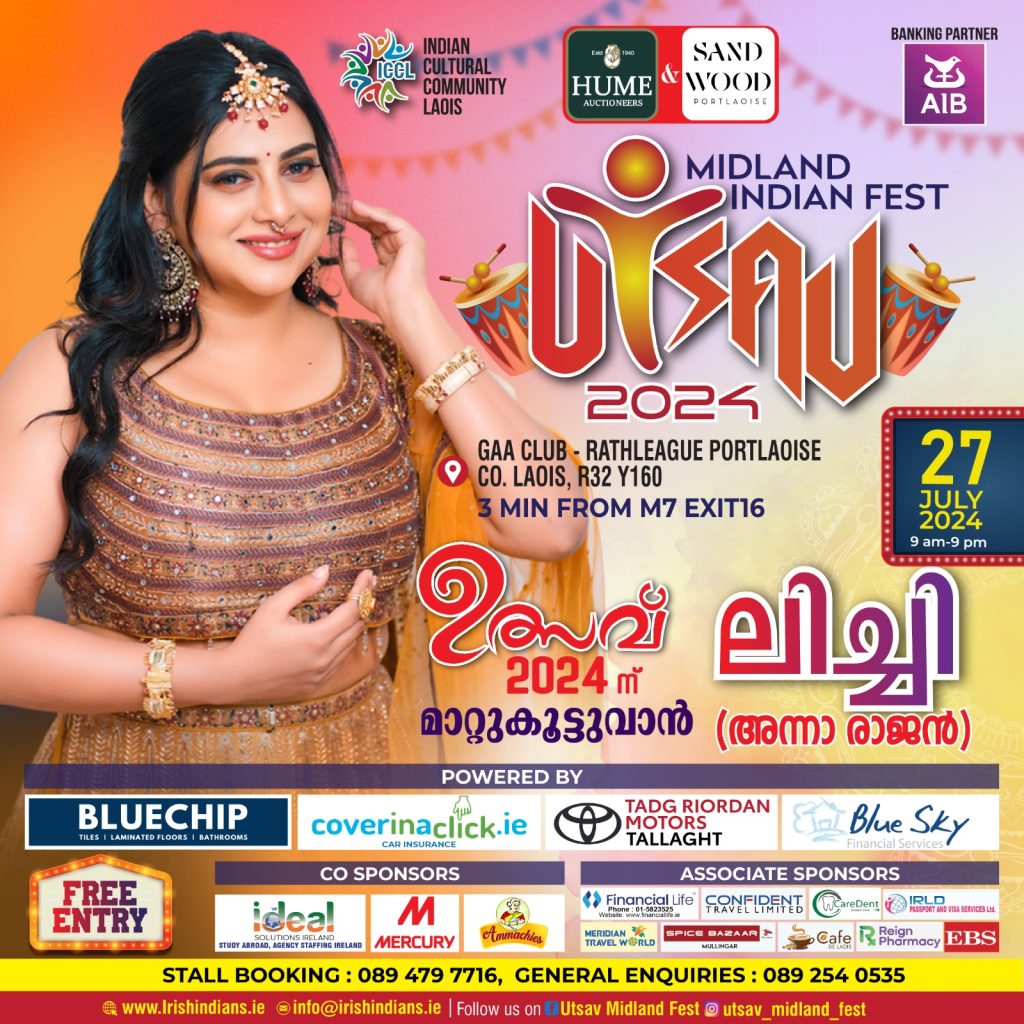 Indian Cultural Community Laois-ന്റെ നേതൃത്വത്തിൽ നടക്കുന്ന മിഡ്ലാൻഡ് ഇന്ത്യൻ ഫെസ്റ്റ് ‘ഉത്സവ് 2024’-ൽ അതിഥിയായി പ്രശസ്ത സിനിമ താരം അന്ന രേഷ്മ രാജൻ (ലിച്ചി) എത്തുന്നു. ജൂലൈ 27 ന് കൗണ്ടി ലീഷിലെ Rathleague Portloise-ലുള്ള GAA Club-ൽ വച്ചാണ് ‘ഉത്സവ് 2024’ അരങ്ങേറുന്നത്.