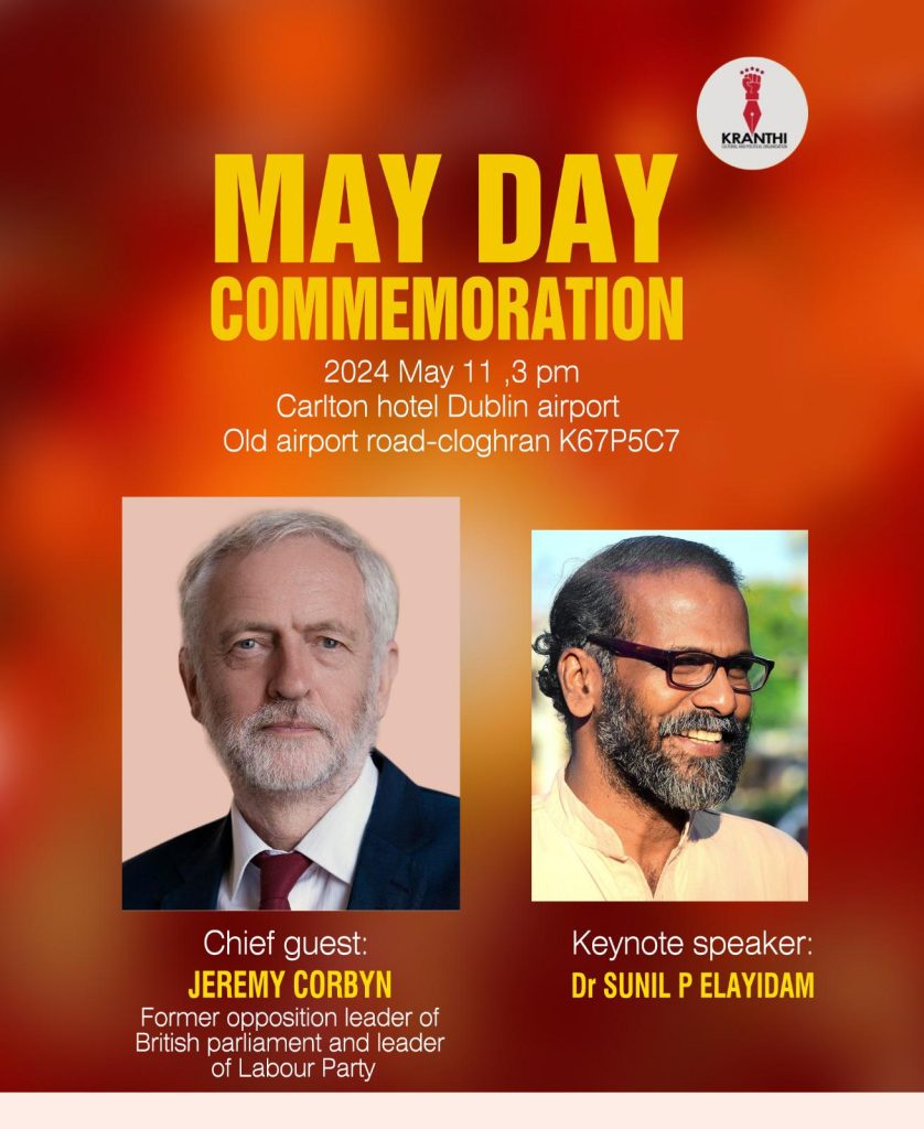 ഡബ്ലിൻ: ക്രാന്തിയുടെ നേതൃത്വത്തിൽ സംഘടിപ്പിക്കുന്ന മെയ്ദിന അനുസ്മരണ പരിപാടികൾക്കായി എഴുത്തുകാരനും പ്രഭാഷകനുമായ സുനിൽ പി ഇളയിടവും ,ബ്രിട്ടനിലെ മുൻ പ്രതിപക്ഷ നേതാവും ലേബർ പാർട്ടി നേതാവുമായി പ്രവർത്തിച്ച