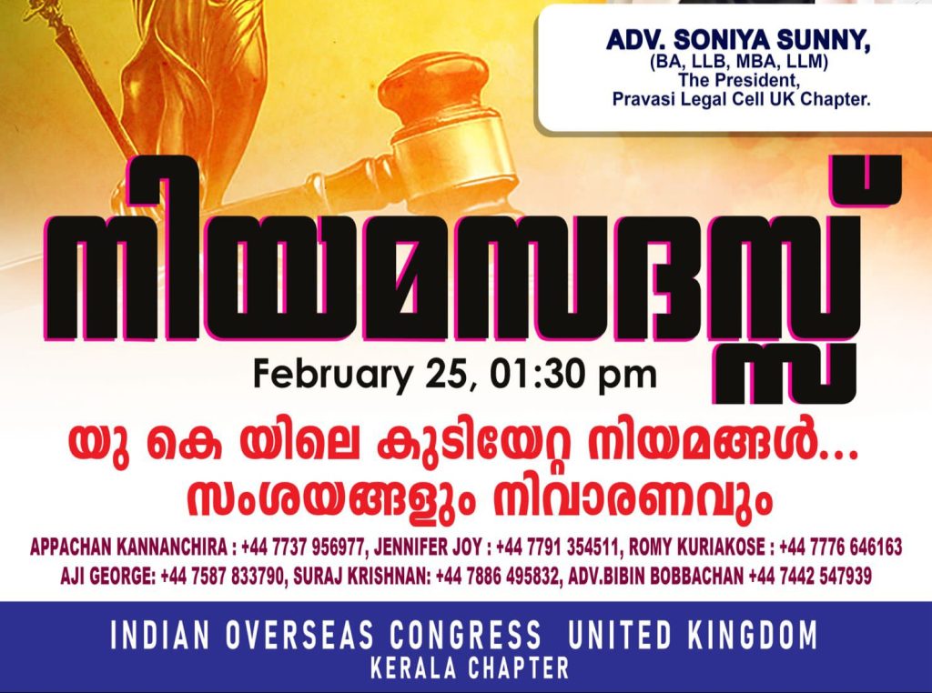ലണ്ടൻ: ഐഒസി (യു.കെ) – കേരള ചാപ്റ്റർ യു.കെയിലെ പ്രമുഖ നിയമവിദഗ്ധരെ പങ്കെടുപ്പിച്ചുകൊണ്ട് സംഘടിപ്പിക്കുന്ന ‘നിയമസദസ്സ്’ ഫെബ്രുവരി 25 ഞായറാഴ്ച 01.30-ന് നടത്തപ്പെടും. യു.കെയിൽ പ്രാബല്യത്തിൽ വന്ന പുതിയ കുടിയേറ്റ നിയമങ്ങൾ വിശദീകരിച്ചുകൊണ്ടും, പഠനം, തൊഴിൽ സംബന്ധമായി അടുത്തിടെ യു കെയിൽ വന്ന നിയമ മാറ്റങ്ങളിലെ സംശയങ്ങൾക്കും ആശങ്കകൾക്കുമുള്ള മറുപടിയും ഈ മേഖലയിലെ നിയമ വിദഗ്ധർ ‘നിയമസദസ്സി’ലൂടെ നൽകും.
