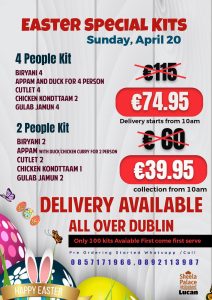 ഈ ഈസ്റ്ററിന് രുചിയൂറുന്ന കിടിലന് കിറ്റുകളുമായി അയര്ലണ്ടിലെ പ്രിയപ്പെട്ട ഇന്ത്യന് റസ്റ്ററന്റ് ആയ ഷീല പാലസ്. നാല് പേര്ക്ക് കഴിക്കാവുന്ന കിറ്റിന് വെറും 74.95 യൂറോ ആണ് വില. നാല് ബിരിയാണി, നാല് പേര്ക്ക് കഴിക്കാവുന്ന അപ്പവും താറാവ് കറിയും, നാല് കട്ലറ്റ്, രണ്ട് ചിക്കന് കൊണ്ടാട്ടം, നാലു് ഗുലാബ് ജാമുന് എന്നിവയാണ് കിറ്റില് ഉണ്ടാകുക. ഈസ്റ്റര് ദിനമായ ഏപ്രില് 20 രാവിലെ 10 മണി മുതല് ഡെലിവറി ആരംഭിക്കും.