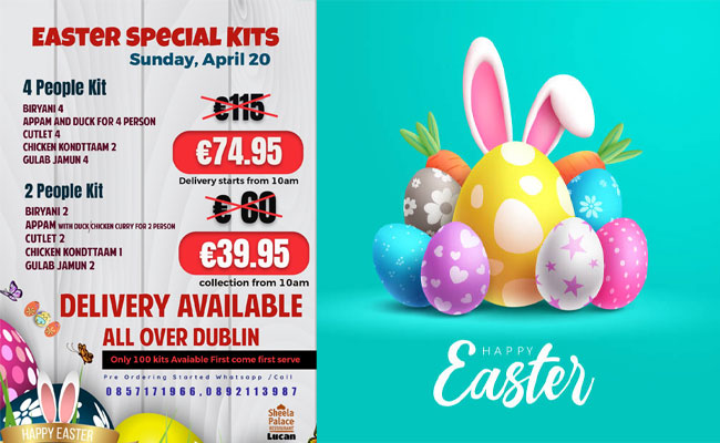 ഈ ഈസ്റ്ററിന് രുചിയൂറുന്ന കിടിലന് കിറ്റുകളുമായി അയര്ലണ്ടിലെ പ്രിയപ്പെട്ട ഇന്ത്യന് റസ്റ്ററന്റ് ആയ ഷീല പാലസ്. നാല് പേര്ക്ക് കഴിക്കാവുന്ന കിറ്റിന് വെറും 74.95 യൂറോ ആണ് വില. നാല് ബിരിയാണി, നാല് പേര്ക്ക് കഴിക്കാവുന്ന അപ്പവും താറാവ് കറിയും, നാല് കട്ലറ്റ്, രണ്ട് ചിക്കന് കൊണ്ടാട്ടം, നാലു് ഗുലാബ് ജാമുന് എന്നിവയാണ് കിറ്റില് ഉണ്ടാകുക. ഈസ്റ്റര് ദിനമായ ഏപ്രില് 20 രാവിലെ 10 മണി മുതല് ഡെലിവറി ആരംഭിക്കും.