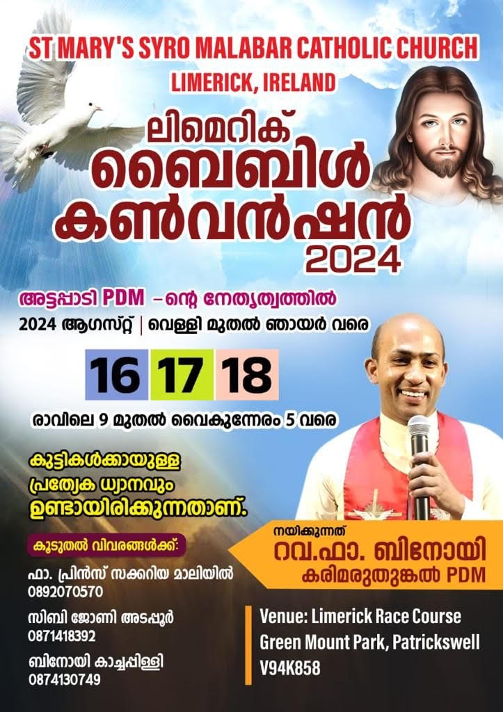 സെന്റ് മേരീസ് സീറോ മലബാർ ചർച്ച് ലിമെറിക്കിന്റെ ആഭിമുഖ്യത്തിൽ എല്ലാ വർഷവും നടത്തി വരാറുള്ള ‘ലിമെറിക് ബൈബിൾ കൺവെൻഷൻ’ ഈ വർഷം ഓഗസ്റ്റ് 16,17,18 (വെള്ളി, ശനി, ഞായർ) ദിവസങ്ങളിൽ രാവിലെ 9 മുതൽ വൈകിട്ട് 5 വരെ ലിമെറിക്ക്, പാട്രിക്സ്വെൽ റേസ് കോഴ്സ് ഓഡിറ്റോറിയത്തിൽ വെച്ച് നടക്കും. അട്ടപ്പാടി PDM-ന്റെ നേതൃത്വത്തിൽ പ്രശസ്ത ധ്യാന ഗുരു റെവ. ഫാ. ബിനോയ് കരിമരുതുങ്കൽ PDM ആണ് ഈ വർഷത്തെ കൺവെൻഷൻ നയിക്കുന്നത്.