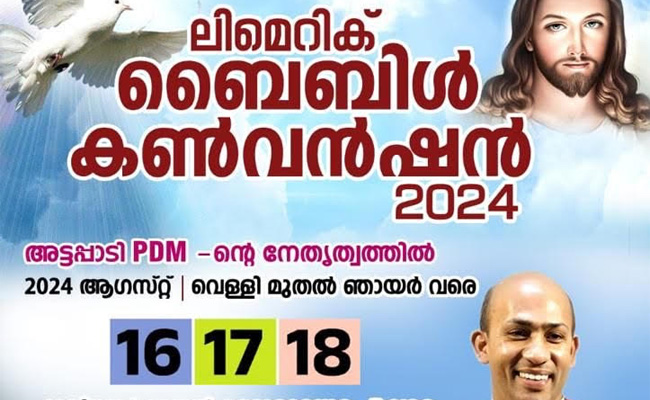 സെന്റ് മേരീസ് സീറോ മലബാർ ചർച്ച് ലിമെറിക്കിന്റെ ആഭിമുഖ്യത്തിൽ എല്ലാ വർഷവും നടത്തി വരാറുള്ള ‘ലിമെറിക് ബൈബിൾ കൺവെൻഷൻ’ ഈ വർഷം ഓഗസ്റ്റ് 16,17,18 (വെള്ളി, ശനി, ഞായർ) ദിവസങ്ങളിൽ രാവിലെ 9 മുതൽ വൈകിട്ട് 5 വരെ ലിമെറിക്ക്, പാട്രിക്സ്വെൽ റേസ് കോഴ്സ് ഓഡിറ്റോറിയത്തിൽ വെച്ച് നടക്കും. അട്ടപ്പാടി PDM-ന്റെ നേതൃത്വത്തിൽ പ്രശസ്ത ധ്യാന ഗുരു റെവ. ഫാ. ബിനോയ് കരിമരുതുങ്കൽ PDM ആണ് ഈ വർഷത്തെ കൺവെൻഷൻ നയിക്കുന്നത്.