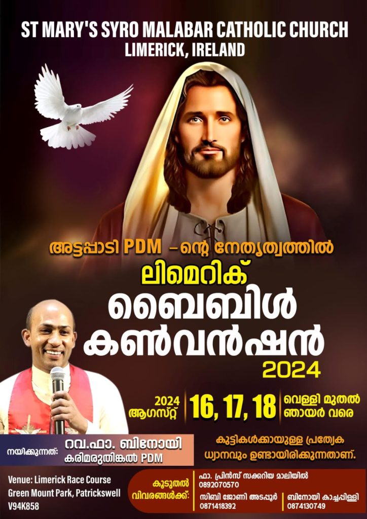 ലിമെറിക്ക്: സെന്റ് മേരീസ് സീറോ മലബാർ ചർച്ച് ലിമെറിക്കിന്റെ ആഭിമുഖ്യത്തിൽ എല്ലാ വർഷവും നടത്തി വരാറുള്ള ‘ലിമെറിക് ബൈബിൾ കൺവെൻഷൻ’ ഈ വർഷം ഓഗസ്റ്റ് 16,17,18 (വെള്ളി,ശനി,ഞായർ) ദിവസങ്ങളിൽ രാവിലെ 9 മുതൽ വൈകിട്ട് 5 വരെ ലിമെറിക്ക് പാട്രിക്സ്വെൽ റേസ് കോഴ്സ് ഓഡിറ്റോറിയത്തിൽ വെച്ച് നടക്കും. അട്ടപ്പാടി PDM-ന്റെ നേതൃത്വത്തിൽ പ്രശസ്ത ധ്യാനഗുരു റവ.ഫാ. ബിനോയ് കരിമരുതുങ്കൽ PDM ആണ് ഈ വർഷത്തെ കൺവെൻഷൻ നയിക്കുന്നത്.