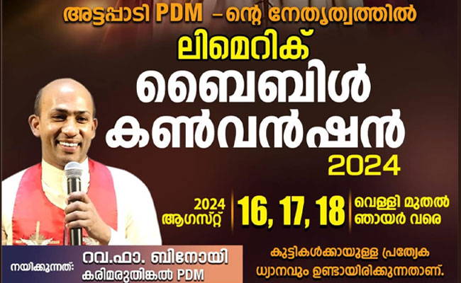 ലിമെറിക്ക്: സെന്റ് മേരീസ് സീറോ മലബാർ ചർച്ച് ലിമെറിക്കിന്റെ ആഭിമുഖ്യത്തിൽ എല്ലാ വർഷവും നടത്തി വരാറുള്ള ‘ലിമെറിക് ബൈബിൾ കൺവെൻഷൻ’ ഈ വർഷം ഓഗസ്റ്റ് 16,17,18 (വെള്ളി,ശനി,ഞായർ) ദിവസങ്ങളിൽ രാവിലെ 9 മുതൽ വൈകിട്ട് 5 വരെ ലിമെറിക്ക് പാട്രിക്സ്വെൽ റേസ് കോഴ്സ് ഓഡിറ്റോറിയത്തിൽ വെച്ച് നടക്കും. അട്ടപ്പാടി PDM-ന്റെ നേതൃത്വത്തിൽ പ്രശസ്ത ധ്യാനഗുരു റവ.ഫാ. ബിനോയ് കരിമരുതുങ്കൽ PDM ആണ് ഈ വർഷത്തെ കൺവെൻഷൻ നയിക്കുന്നത്.