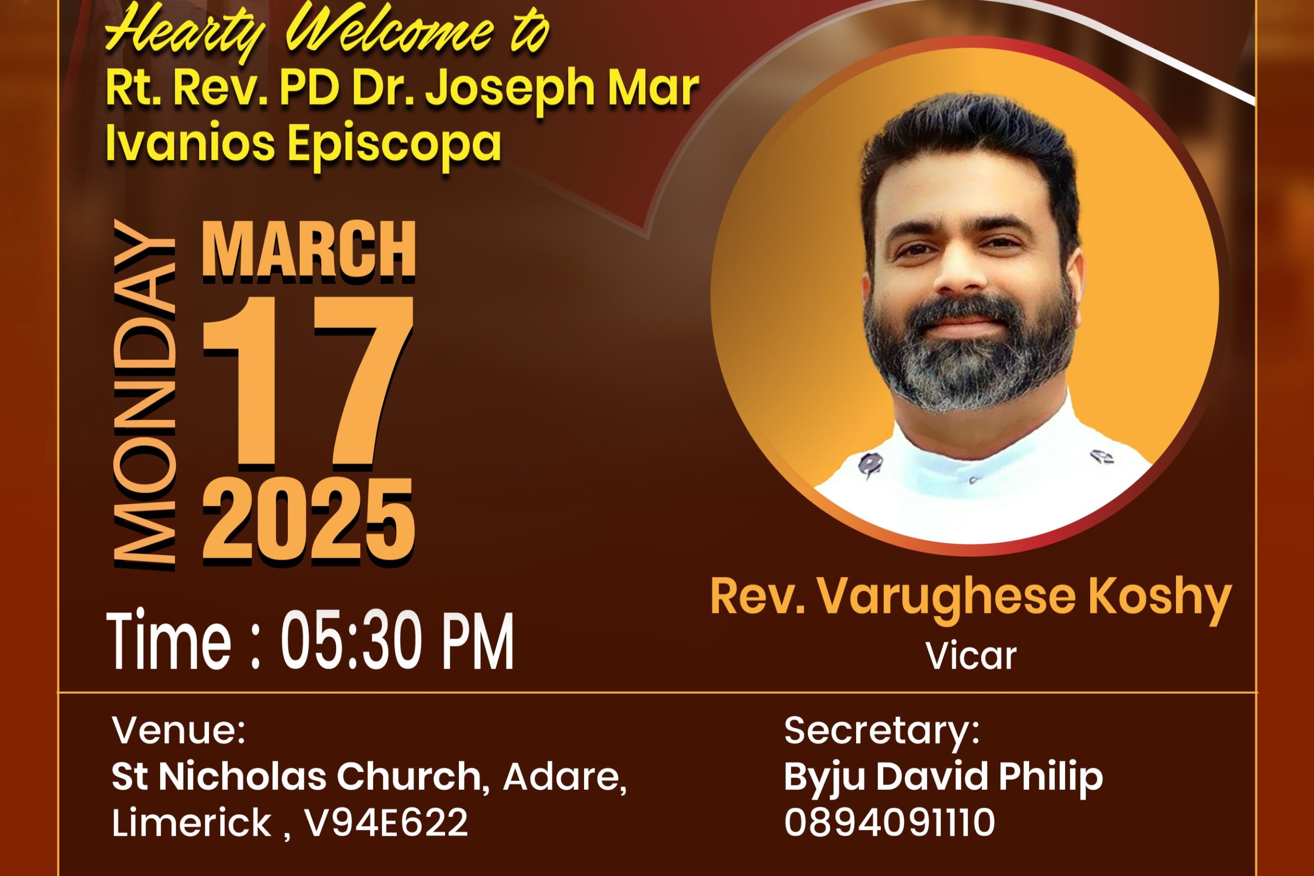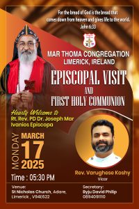 ലിമെറിക്ക്: ലിമെറിക്ക് മാർത്തോമാ കോൺഗ്രിഗേഷന്റെ 2025 മാർച്ച് 17-ആം തീയതി തിങ്കളാഴ്ച വൈകുന്നേരം ക്രമീകരിച്ച വിശുദ്ധ കുർബാനയിലും, ആദ്യകുർബാന ശുശ്രൂഷയിലും മലങ്കര മാർത്തോമ്മാ സുറിയാനി സഭ UK – Europe ഭദ്രാസനാധ്യക്ഷൻ അഭിവന്ദ്യ ഡോ. ജോസഫ് മാർ ഇവാനിയോസ് Episcopa കാർമികത്വം വഹിക്കും.