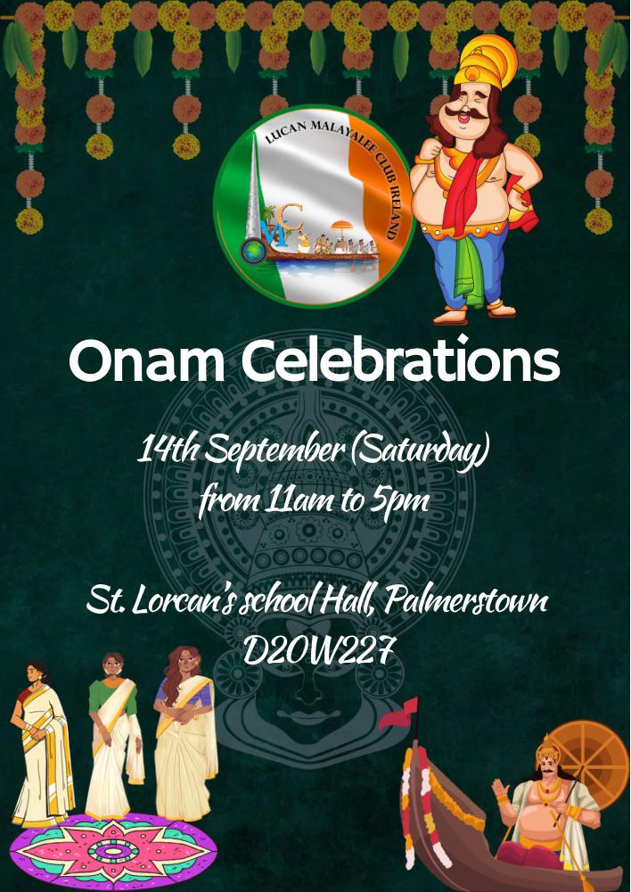 ഡബ്ലിൻ: ലൂക്കൻ മലയാളി ക്ലബ്ബിന്റെ നേതൃത്വത്തിലുള്ള ഓണാഘോഷം സെപ്റ്റംബർ 14 ശനി രാവിലെ 11 മുതൽവൈകിട്ട് 6 വരെ പാമേഴ്സ്ടൌൺ സെന്റ് ലോർക്കൻസ് സ്കൂൾ ഹാളിൽ നടക്കും. കുട്ടികൾക്കും മുതിർന്നവർക്കുമുള്ള കായികമത്സരങ്ങൾക്ക് ശേഷം സ്ത്രീകൾക്കും പുരുഷന്മാർക്കുമുള്ള വടംവലി മത്സരം നടക്കും. തുടർന്ന് വിഭവസമൃദ്ധമായ ഓണസദ്യ.
