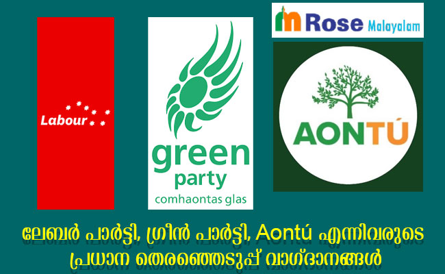 Sinn Fein, Fine Gael, Fianna Fail, People Before Profit- Solidarity, Social Democrats എന്നിവരുടെ തെരഞ്ഞെടുപ്പ് വാഗ്ദാനങ്ങള് എന്തെല്ലാമാണെന്ന് കഴിഞ്ഞയാഴ്ചയില് നമ്മള് വായിച്ചു. ഇതാ മറ്റ് പാര്ട്ടികളായ ലേബര് പാര്ട്ടി, ഗ്രീന് പാര്ട്ടി, Aontu എന്നിവരുടെ പ്രധാന തെരഞ്ഞെടുപ്പ് വാഗ്ദാനങ്ങള് എന്തെല്ലാമാണെന്ന് നോക്കാം.