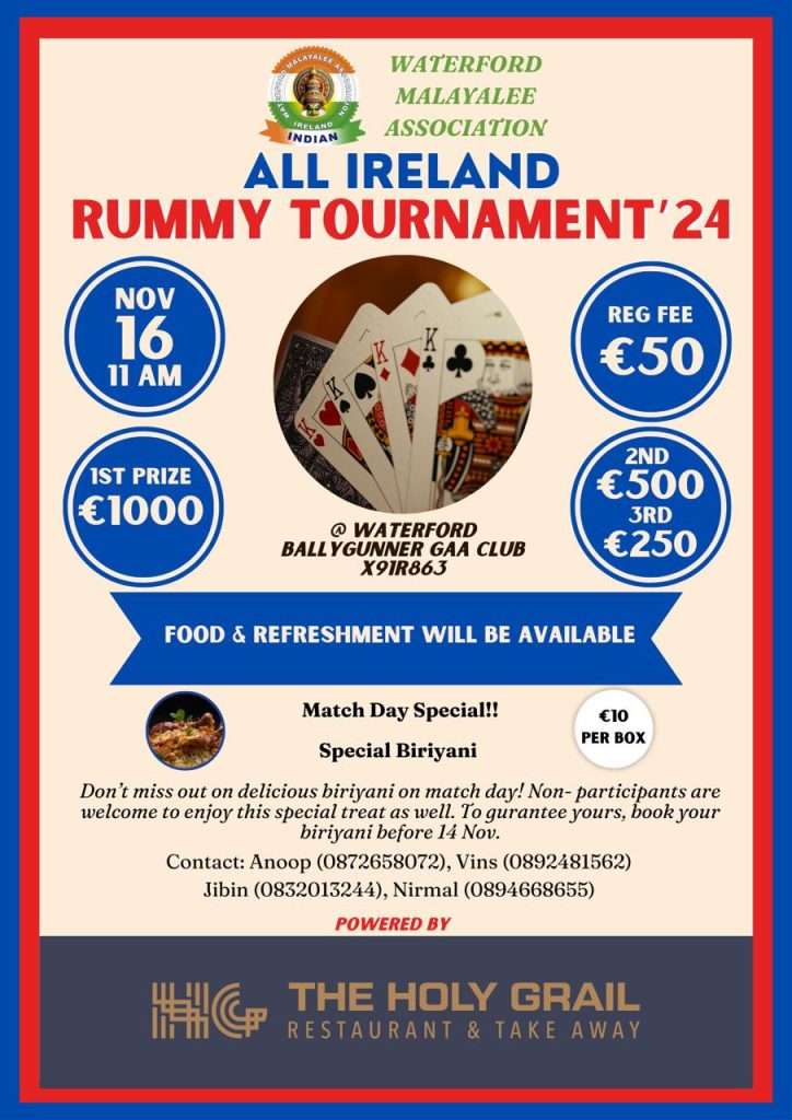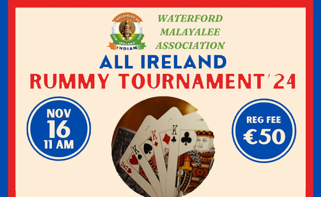വാട്ടർഫോർഡ്: വാട്ടർഫോർഡ് മലയാളി അസോസിയേഷന്റെ (WMA) ആഭിമുഖ്യത്തിൽ സംഘടിപ്പിക്കുന്ന ഓൾ അയർലണ്ട് റമ്മി ടൂർണമെന്റിന്റെ ഒരുക്കങ്ങൾ പൂർത്തിയായി. വാട്ടർഫോർഡിലെ ബാലിഗണർ GAA ക്ലബ്ബിൽ നാളെ രാവിലെ 11 മണി മുതൽ വൈകുന്നേരം 5 മണി വരെയാണ് ടൂർണമെന്റ് നടത്തപ്പെടുന്നത്.