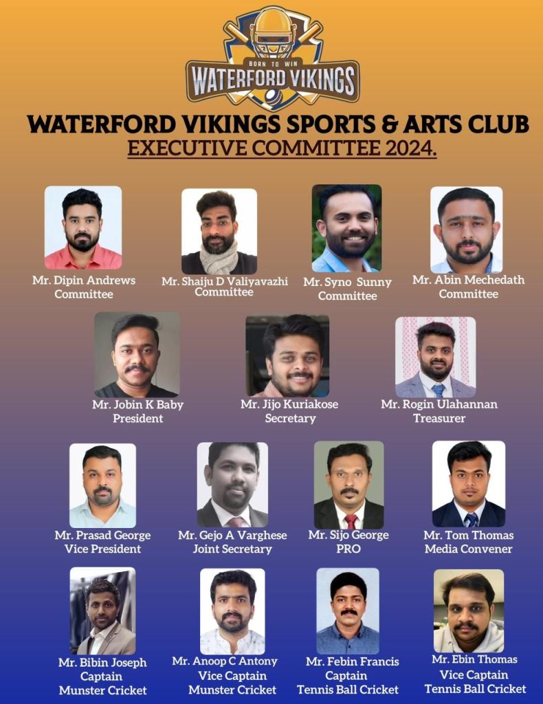 20/01/2024 ശനിയാഴ്ച ബാലിഗണർ ജി എ എ ക്ലബ്ബിൽ കൂടിയ വൈക്കിങ്സ് പൊതുയോഗത്തിൽ പുതിയ ഭാരവാഹികളായി തിരഞ്ഞെടുക്കപ്പെട്ട്, വൈക്കിങ്സ് കുടുംബാംഗങ്ങളെ നയിക്കുന്നവർ ഇവരാണ്