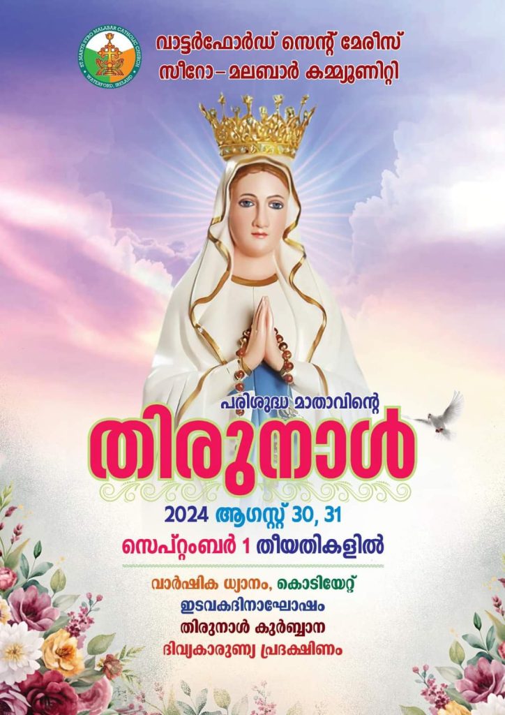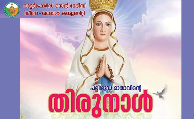 വാട്ടർഫോർഡ് സെന്റ് മേരീസ് സീറോ മലബാർ കമ്മ്യൂണിറ്റിയുടെ നേതൃത്വത്തിൽ പരി. മാതാവിന്റെ തിരുനാൾ ആഗസ്റ്റ് 30, 31, സെപ്റ്റംബർ 01 തീയതികളിൽ സമുചിതമായി ആഘോഷിക്കുന്നു.