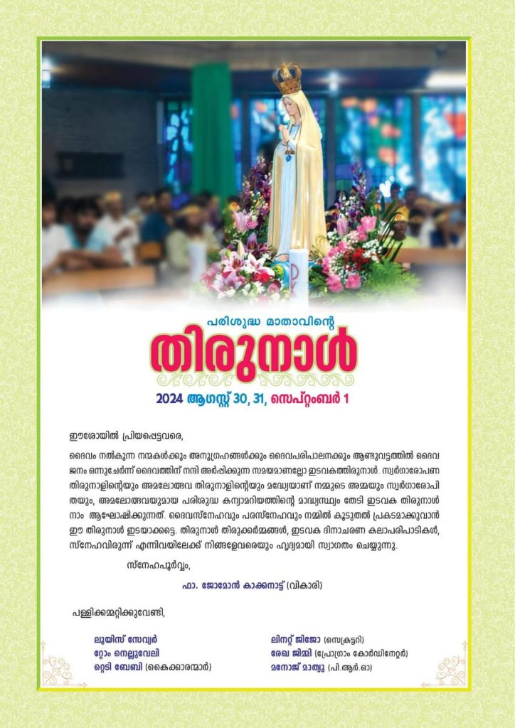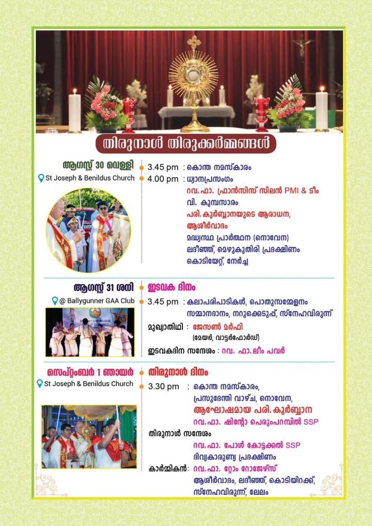 ആഗസ്റ്റ് 31 ശനിയാഴ്ച ഇടവക ദിനാഘോഷം, പൊതുസമ്മേളനം, (മുഖ്യാതിഥി Cllr ജേസൺ മർഫി, മേയർ വാട്ടർഫോർഡ്), കലാസന്ധ്യ, സ്നേഹവിരുന്ന്. സെപ്റ്റംബർ 01 ഞായറാഴ്ച പ്രധാന തിരുനാൾ ദിനം ജപമാല, പ്രസുദേന്തി വാഴ്ച, ആഘോഷമായ തിരുനാൾ കുർബാന (ഫാ. ഷിന്റോ പെരുമ്പറമ്പിൽ SSP), തിരുനാൾ സന്ദേശം റവ. ഫാ. പോൾ കോട്ടക്കൽ SSP, തുടർന്ന് ഫാ. ടോം റോജേർസ് നയിക്കുന്ന ദിവ്യകാരുണ്യ പ്രദക്ഷിണം, ആശീർവാദം, ലദീഞ്ഞ്, കൊടിയിറക്ക്, സ്നേഹവിരുന്ന്, ലേലം. എല്ലാവരും ഈ ദിവസങ്ങളിൽ പ്രാർത്ഥനാപൂർവം പങ്കെടുക്കണമെന്ന് ഇടവക വികാരി ഫാ. ജോമോൻ കാക്കനാട്ട് അറിയിച്ചു.