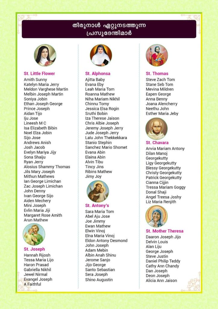 കൈക്കാരന്മാർ : ലൂയിസ് സേവ്യർ, ടോം നെല്ലുവേലി, ടെഡി ബേബി. സെക്രട്ടറി: ലിനറ്റ് ജിജോ. പ്രോഗ്രാം കോർഡിനേറ്റർ: രേഖ ജിമ്മി. പി.ആർ.ഓ: മനോജ് മാത്യു, പാരീഷ് കൗൺസിൽ അഗങ്ങൾ എന്നിവർ പരിപാടികൾക്ക് നേതൃത്വം നൽകും.