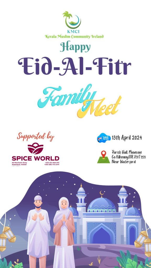ആത്മ സംസ്കരണത്തിന്റെ മാസമായ പുണ്യറമളാനിന്നു ശേഷം ഉള്ള ആഘോഷമായ ഈദുൽ ഫിത്ർ ഏപ്രിൽ 13-ന് MOONCOIN പാരിഷ് ഹാളിൽ വച്ചു നടത്തപെടുന്നു (MoonCoin Parish Hall Co-Kilkenny, Near വാട്ടർഫോർഡ്).