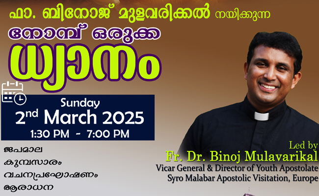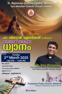 വലിയ നോമ്പിന് ഒരുക്കമായി അയർലണ്ട് സീറോ മലബാർ സഭയുടെ വെക്സ്ഫൊർഡ് സെൻ്റ് അൽഫോൻസ കുർബാന സെൻ്റർ സംഘടിപ്പിക്കുന്ന ഏകദിന ധ്യാനം വെക്സ്ഫോർഡ് ഫ്രാൻസീസ്കൻ ഫ്രയറി ദേവാലയത്തിൽ നടക്കും. 2025 മാർച്ച് 2 ഞായറാഴ്ച ഉച്ചകഴിഞ്ഞ് 1:30 മുതൽ വൈകിട്ട് 7:00 വരെയാണ് ധ്യാനം ക്രമീകരിച്ചിരിക്കുന്നത്. പ്രശസ്ത ധ്യാനഗുരുവും, സീറോ മലബാര് അപ്പസ്തോലിക് വിസിറ്റേഷൻ വികാരി ജനറാളും യൂത്ത് അപ്പോസ്റ്റലേറ്റ് യൂറോപ്പ് ഡയറക്ടറും, മ്യൂസിഷ്യനും, ശ്രദ്ധേയമായ നിരവധി ഭക്തി ഗാനങ്ങളുടെ സൃഷ്ടാവുമായ ഫാ. ഡോ. ബിനോജ് മുളവരിക്കലാണ് ധ്യാനം നയിക്കുന്നത്.
