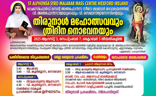 വെക്സ്ഫോർഡ് (അയർലണ്ട്):  വെക്സ്ഫോർഡ് സെൻ്റ് അൽഫോൻസാ സീറോ മലബാർ കമ്യൂണിറ്റിയിൽ   ഇടവക മധ്യസ്ഥയായ വി. അൽഫോൻസാമ്മയുടേയും, പരിശുദ്ധ ദൈവമാതാവിൻ്റേയും വി. സെബസ്ത്യാനോസിന്റെയും സംയുക്ത തിരുനാൾ  2025 ഒക്ടോബർ 5 ഞായറാഴ്ച വിപുലമായ രീതിയില്‍ ആഘോഷിക്കുന്നു.