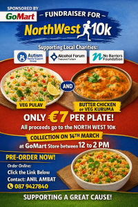 അയര്ലണ്ടിലെ Donegal-ല് ഉള്ള ഓട്ടിസം ഫാമിലി സപ്പോര്ട്ട് ഗ്രൂപ്പ്, ആല്ക്കഹോള് ഫോറം, നോ ബാരിയേഴ്സ് ഫൗണ്ടേഷന് എന്നീ ചാരിറ്റി സംഘടനകള്ക്കായുള്ള ധനസമാഹരണത്തിനായി NorthWest 10K, GoMart Supermarket എന്നിവര് സഹകരിച്ച് ഭക്ഷണ ചലഞ്ച് നടത്തപ്പെടുന്നു. വെജ് പുവാലിനൊപ്പം ബട്ടര് ചിക്കന് അല്ലെങ്കില് വെജ് കുറുമ എന്നിവ വെറും 7 യൂറോയ്ക്ക് ലഭിക്കപ്പെടുന്ന ഭക്ഷണ ചലഞ്ചില് പങ്കെടുക്കുക വഴി ലഭിക്കുന്ന മുഴുവന് തുകയും ചാരിറ്റി പ്രവര്ത്തനങ്ങളിലേയ്ക്കാണ് പോകുക. ലഭിക്കുന്ന തുക മാര്ച്ച് 14-ന് Letterkenny-യിലെ GoMart Supermarket-ല് പകല് 12 മണിക്കും 2 മണിക്കും ഇടയില് ശേഖരിച്ച് NorthWest 10K വഴി ചാരിറ്റികള്ക്ക് കൈമാറും.