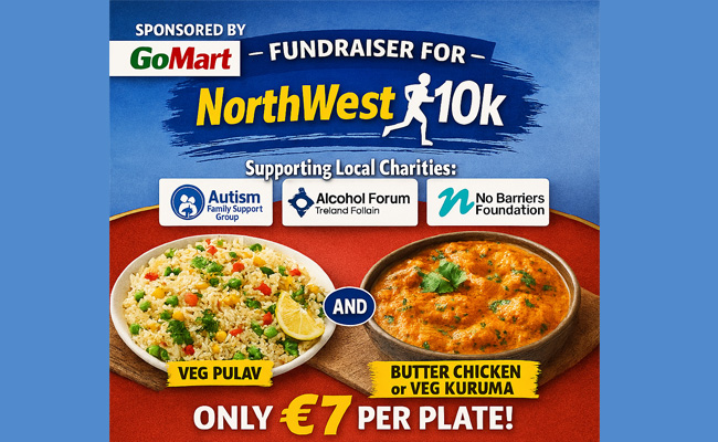 അയര്ലണ്ടിലെ Donegal-ല് ഉള്ള ഓട്ടിസം ഫാമിലി സപ്പോര്ട്ട് ഗ്രൂപ്പ്, ആല്ക്കഹോള് ഫോറം, നോ ബാരിയേഴ്സ് ഫൗണ്ടേഷന് എന്നീ ചാരിറ്റി സംഘടനകള്ക്കായുള്ള ധനസമാഹരണത്തിനായി NorthWest 10K, GoMart Supermarket എന്നിവര് സഹകരിച്ച് ഭക്ഷണ ചലഞ്ച് നടത്തപ്പെടുന്നു. വെജ് പുവാലിനൊപ്പം ബട്ടര് ചിക്കന് അല്ലെങ്കില് വെജ് കുറുമ എന്നിവ വെറും 7 യൂറോയ്ക്ക് ലഭിക്കപ്പെടുന്ന ഭക്ഷണ ചലഞ്ചില് പങ്കെടുക്കുക വഴി ലഭിക്കുന്ന മുഴുവന് തുകയും ചാരിറ്റി പ്രവര്ത്തനങ്ങളിലേയ്ക്കാണ് പോകുക. ലഭിക്കുന്ന തുക മാര്ച്ച് 14-ന് Letterkenny-യിലെ GoMart Supermarket-ല് പകല് 12 മണിക്കും 2 മണിക്കും ഇടയില് ശേഖരിച്ച് NorthWest 10K വഴി ചാരിറ്റികള്ക്ക് കൈമാറും.