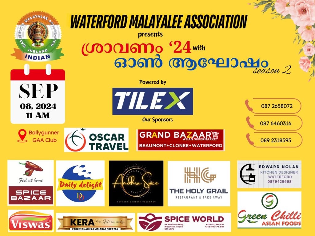 വാട്ടർഫോർഡിലെ മുഴുവൻ പ്രവാസി മലയാളികളെയും ഓണാഘോഷ പരിപാടിയിലേക്ക് സ്വാഗതം ചെയ്യുന്നതായി WMA കമ്മിറ്റി അറിയിച്ചു.