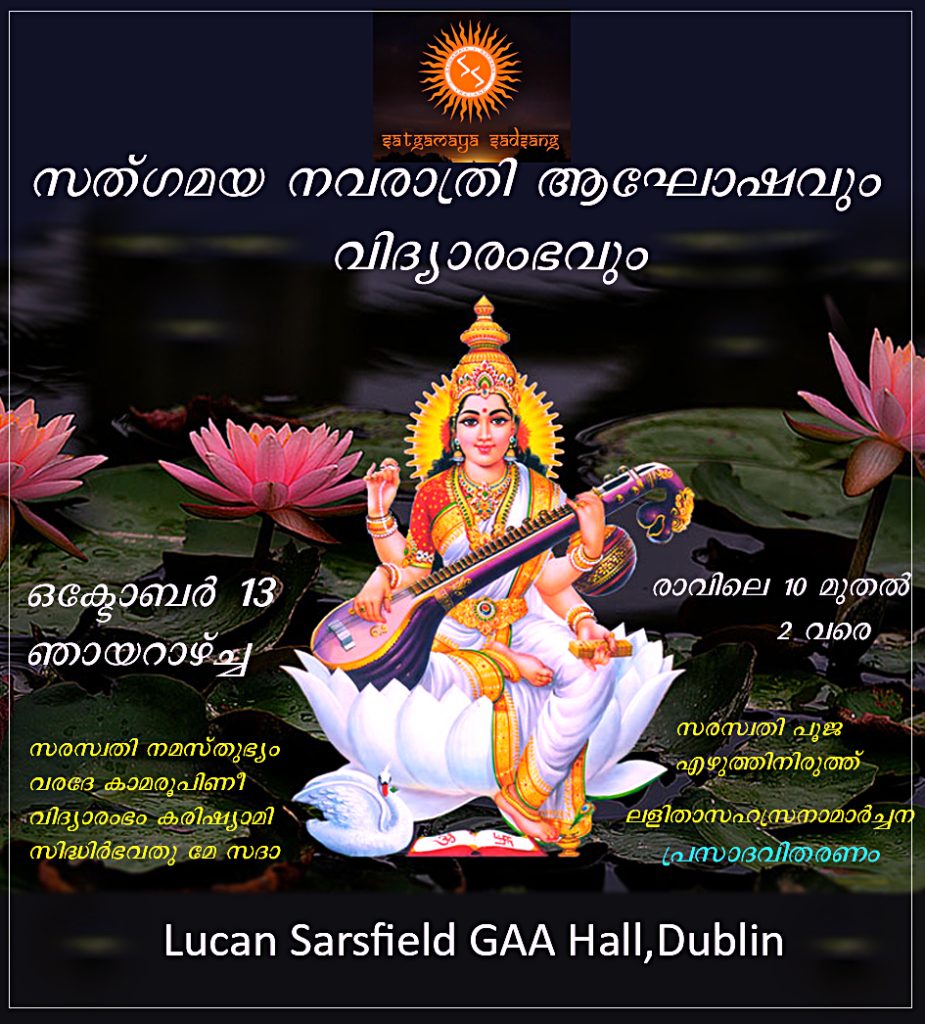 ഡബ്ലിൻ: അയർലണ്ടിലെ ആദ്യ ഹിന്ദുമലയാളി കൂട്ടായ്മയായ സത്ഗമയ സത്സംഘിന്റെ നേതൃതത്തിൽ നവരാത്രി ആഘോഷവും വിദ്യാരംഭവും, വിജയദശമി ദിനമായ ഒക്ടോബർ 13 ഞായറാഴ്ച്ച നടത്തപ്പെടും.