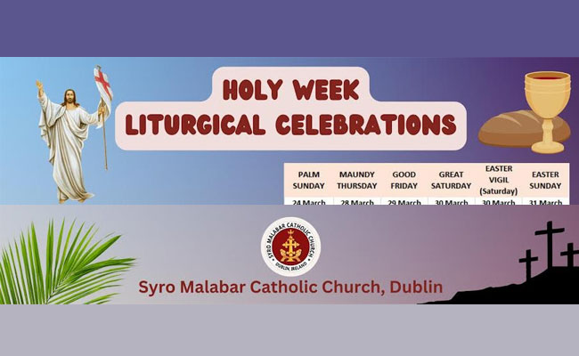 ഡബ്ലിൻ: ഡബ്ലിൻ സീറോ മലബാർ ചർച്ചിൽ വിശുദ്ധ വാരാചരണത്തിന് ഓശാന ഞായറാഴ്ച തുടക്കം കുറിക്കും. യേശു ക്രിസ്തുവിന്റെ പീഢാനുഭവത്തിന്റെ സ്മരണ പുതുക്കപ്പെടുന്ന ഈ കാലയളവിൽ സ്വർഗോന്മുഖ യാത്ര ചെയ്യുന്ന വിശ്വാസ സമൂഹം വചനാ അധിഷ്ഠിത ജീവിതത്തിലൂടെയും, ഉപവി പ്രവൃത്തികൾ വഴിയും, അനുരഞ്ജന ശുശ്രൂഷ സ്വീകരണത്തിലൂടെയും വിശ്വാസ ജീവിതത്തിൽ ആഴപ്പെടുന്നു.