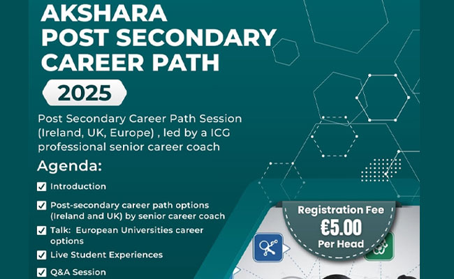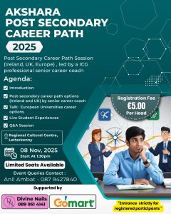 അയര്ലണ്ടിലെയും, യുകെയിലെയും, യൂറോപ്പിലെയും വിദ്യാഭ്യാസ സംവിധാനങ്ങളെ കുറിച്ച് വിദ്യാര്ത്ഥികളെയും, രക്ഷിതാക്കളെയും ബോധവല്ക്കരിക്കുന്നതിനായി Divine Nails Letterkenny-യും Gomart Letterkenny-യും സംയുക്തമായി ‘Post-Secondary Career Path – higher study options’ വിഷയത്തില് സെഷന് സംഘടിപ്പിക്കുന്നു.