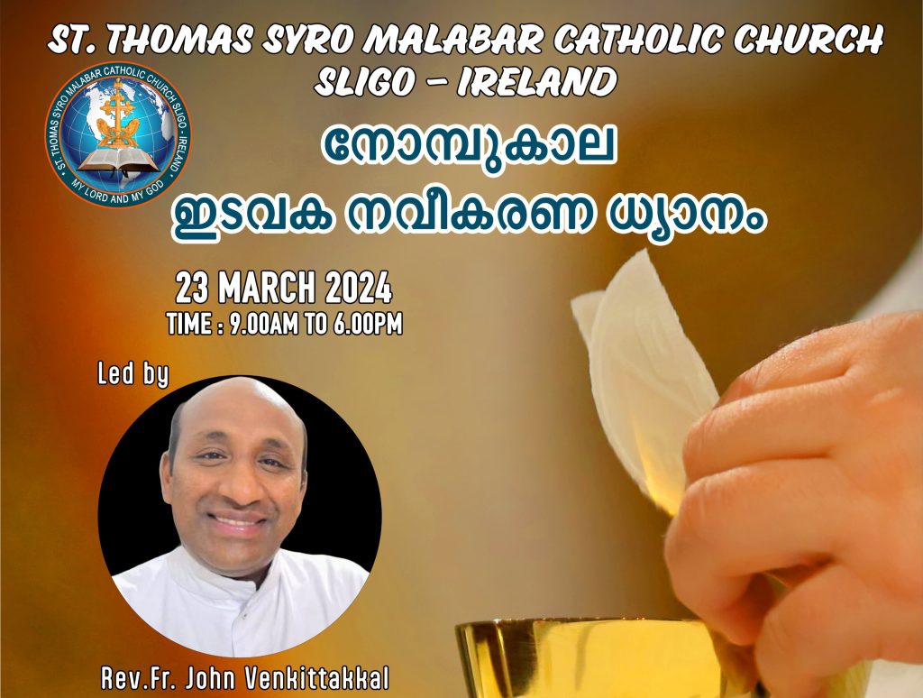 സ്ലൈഗോ സെന്റ് തോമസ് സിറോ മലബാർ കുർബാന സെന്ററിന്റെ ആഭിമുഖ്യത്തിൽ നോമ്പുകാല ധ്യാനം നടത്തപ്പെടുന്നു. 2024 മാർച്ച്‌ 23-ന് സെന്റ് അഞ്ചേലസ് കോളേജ് ഓഡിറ്റോറിയത്തിൽ രാവിലെ 9 മണി മുതൽ വൈകുന്നേരം 6 മണി വരെയുള്ള ധ്യാനം നയിക്കുന്നത് Rev. Fr. ജോൺ വെങ്കിട്ടക്കൽ ആണ്.