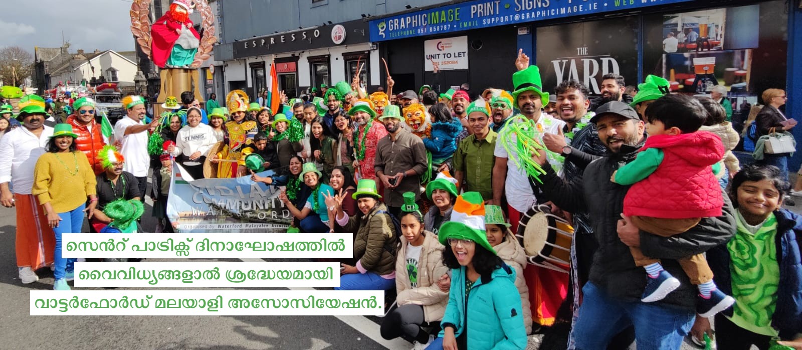 വാട്ടർഫോർഡ്: അയർലണ്ടിലെ ചരിത്രപ്രസിദ്ധമായ സെൻറ് പാട്രിക്സ് ദിനാഘോഷത്തോടനുബന്ധിച്ച് രാജ്യമെങ്ങും നിരവധിയായ പരിപാടികളാണ് സംഘടിപ്പിക്കപ്പെടുന്നത്. വിവിധ പ്രദേശങ്ങളിലായി നടക്കുന്ന വർണ്ണാഭമായ പരേഡുകൾ ഏറെ ജനശ്രദ്ധ ആകർഷിക്കുന്നവയാണ്. വാട്ടർഫോർഡിൽ നടന്ന പരേഡിൽ ഇന്ത്യൻ കമ്മ്യൂണിറ്റിയെ പ്രതിനിധീകരിച്ചു വാട്ടർഫോർഡ് മലയാളി അസോസിയേഷൻ പങ്കെടുത്തു. ജനപങ്കാളിത്തം കൊണ്ടും വ്യത്യസ്തമാർന്ന കലാപരിപാടികൾ കൊണ്ടും കാണികളുടെ പ്രശംസ നേടിയെടുക്കാൻ അസോസിയേഷന്റെ പരേഡിനായി. ഇന്ത്യൻ സംസ്കാരം വിളിച്ചോതുന്ന പരമ്പരാഗത വേഷവിധാനങ്ങളോടു കൂടി കുട്ടികളും മുതിർന്നവരും പങ്കെടുത്ത പരേഡിൽ മഹാബലി, ചെണ്ടമേളം, പുലികളി എന്നിവ ഏറെ ആകർഷകമായിരുന്നു. ആവേശപൂർവ്വം പരേഡിൽ പങ്കെടുത്ത എല്ലാ അംഗങ്ങൾക്കും വാട്ടർഫോർഡ് മലയാളി അസോസിയേഷന്റെ കമ്മിറ്റി നന്ദി അറിയിച്ചു.