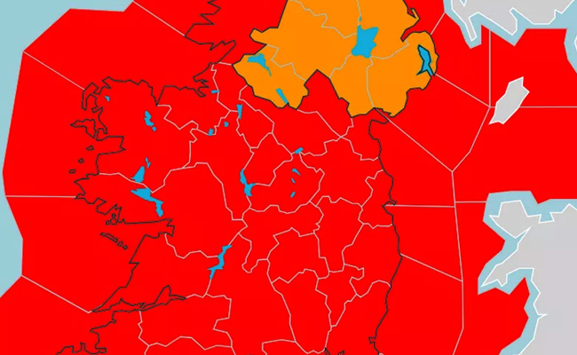 കാർലോ, കിൽക്കെന്നി, വെക്സ്ഫോർഡ്, കൊർക്ക്, കെറി, ലിമറിക്ക്, വാട്ടർഫോർഡ് ജില്ലകളിൽ വെള്ളി പുലർച്ചെ 2 മണി മുതൽ 10 മണി വരെ റെഡ് മുന്നറിയിപ്പ് പ്രാബല്യത്തിൽ വരും.