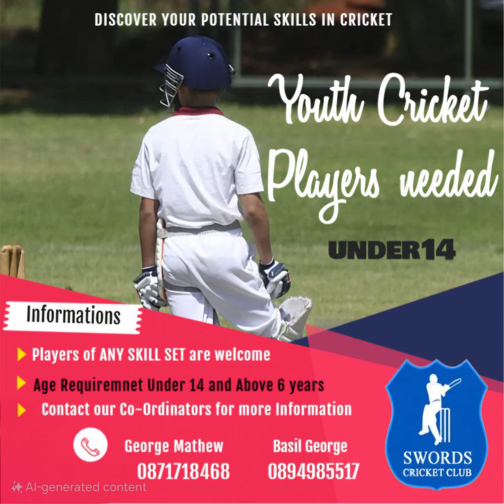 അയര്ലണ്ടിലെ പ്രമുഖ ക്രിക്കറ്റ് ക്ലബ്ബായ സ്വോര്ഡ്സ് ക്രിക്കറ്റ് ക്ലബ്ബില് ചേരാന് അണ്ടര്-14 കളിക്കാര്ക്ക് അവസരം. ഏത് തരം സ്കില് ഉള്ള കളിക്കാര്ക്കും പ്രവേശനത്തിനായി അപേക്ഷിക്കാം. 6 വയസ് മുതല് പരമാവധി 14 വയസ് വരെയാണ് പ്രായപരിധി.