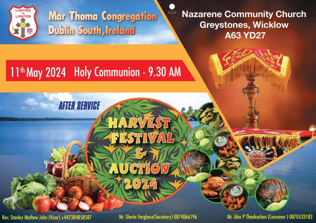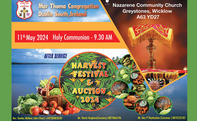 ഡബ്ലിന് സൗത്ത് മാർത്തോമ്മാ കോണ്ഗ്രഗേഷന്റെ ആഭിമുഖ്യത്തില് നടക്കുന്ന ഈ വര്ഷത്തെ ‘കൊയ്ത്തുത്സവം’ മെയ് 11 ശനിയാഴ്ച. രാവിലെ 9.30-ന് വിക്ക്ലോയിലെ ഗ്രേസ്റ്റോണിലുള്ള (A63 YD27) Nazarene Community Church-ല് നടക്കുന്ന വിശുദ്ധ കുര്ബാനയ്ക്ക് ശേഷം പരിപാടികള്ക്ക് തുടക്കമാകും.