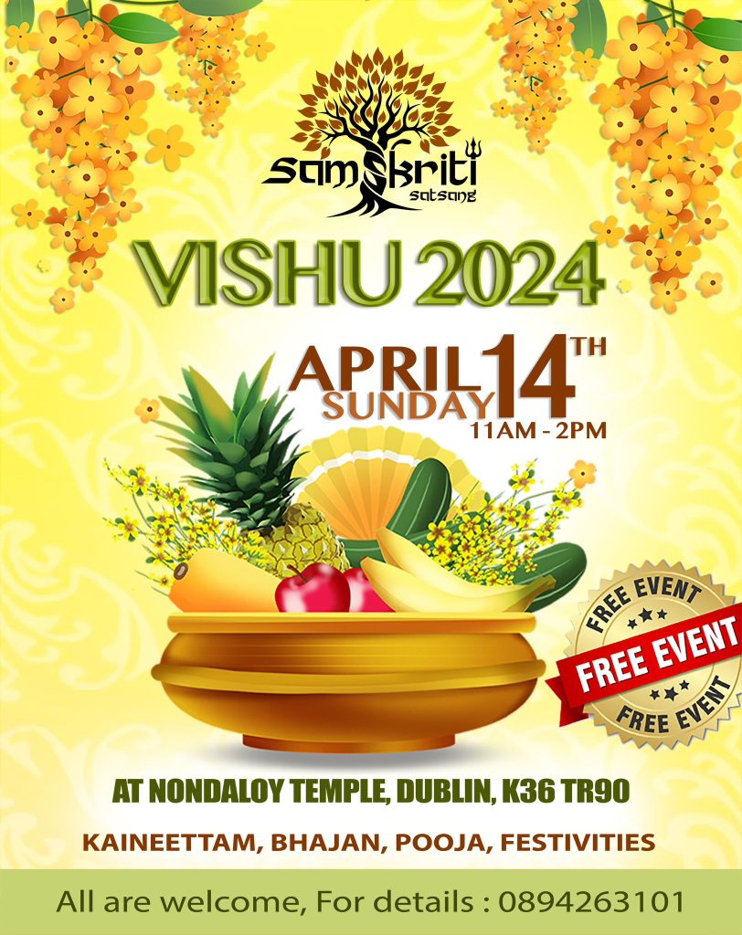 പ്രൗഢിയുടെയും സമൃദ്ധിയുടെയും മറ്റൊരു വിഷുക്കാലം കൂടെ വരവായി. ഈ വരുന്ന 14ാം തീയതി വിഷു അതിന്റെ തനതായ രീതിയിൽ ഡബ്ലിനിലെ നന്ദലോയി ടെമ്പിളിൽ വച്ച് ആഘോഷിക്കാൻ സംസ്‌കൃതി സത്സംഗ് തീരുമാനിച്ചിരിക്കുന്നു. വിഷുക്കണിയും പ്രാർത്ഥനകളും ആയി വിഷുദിവസത്തെ മറ്റൊരു സുദിനമായി മാറ്റാൻ താങ്കളെയും കുടുംബത്തെയും സാദരം ക്ഷണിച്ചുകൊള്ളുന്നുവെന്ന് സംഘാടകർ അറിയിച്ചു.
