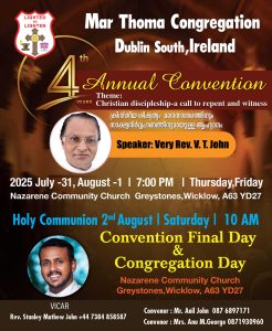 Mar Thoma congregation, Dublin South, Ireland-ന്റെ ആഭിമുഖ്യത്തിലുള്ള ഈ വർഷത്തെ കൺവെൻഷൻ ജൂലൈ 31, ഓഗസ്റ്റ് 1 തീയതികളിലും, Congregation Day വിശുദ്ധ കുർബാനയോടു ചേർന്ന് ഓഗസ്റ്റ് 2 ശനിയാഴ്ച രാവിലെ 10 മണിക്കും Nazarene Community Church, Greystones, Wicklow, A63YD27 വെച്ച് നടത്തപ്പെടുന്നു.