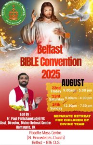 ബെൽഫാസ്റ്റ്: സെൻ്റ്. തോമസ് സീറോ മലബാർ ചർച്ച് ബെൽഫാസ്റ്റിന്റെ നേതൃത്വത്തിൽ നടത്തുന്ന ബെൽഫാസ്റ്റ് ബൈബിൾ കൺവെൻഷൻ ആരംഭിച്ചു. 2025 ഓഗസ്റ്റ് 22,23,24 (വെള്ളി, ശനി, ഞായർ) തീയതികളിൽ ആണ് കൺവെൻഷൻ നടക്കുന്നത്.