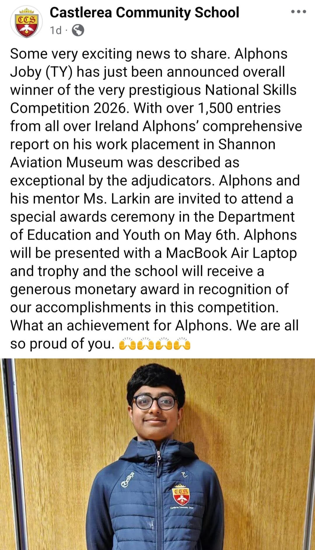 അയർലണ്ടിലെ ദേശീയ സ്കിൽസ് മത്സരം 2026-ൽ (National Skills Competition 2026) കാസിൽറേ കമ്മ്യൂണിറ്റി സ്കൂളിലെ ട്രാൻസിഷൻ ഇയർ (TY) വിദ്യാർത്ഥിയായ അൽഫോൺസ് ജോബിക്ക് തിളക്കമാർന്ന നേട്ടം. അയർലണ്ടിലുടനീളമുള്ള ആയിരത്തിയഞ്ഞൂറിലധികം എൻട്രികളെ പിന്നിലാക്കിയാണ് അൽഫോൺസ് ഒന്നാം സ്ഥാനം കരസ്ഥമാക്കിയത്.