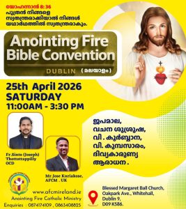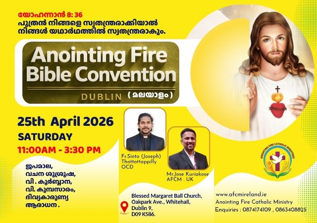 ഡബ്ലിൻ: Anointing Fire Bible Convention (മലയാളം) ഏപ്രിൽ 25 ശനിയാഴ്ച ഡബ്ലിൻ ബ്യൂമൗണ്ടിലെ Blessed Margaret Ball ദേവാലയത്തിൽ രാവിലെ 11 മണി മുതൽ വൈകിട്ട് 3:30 വരെ നടത്തപ്പെടുന്നു. ബഹുമാനപ്പെട്ട സേവ്യർ ഖാൻ വട്ടായിലച്ചനിലൂടെ പരിശുദ്ധാത്മാവ് രൂപം നൽകുകയും അനേകായിരങ്ങളുടെ ജീവിതത്തിൽ വിശ്വാസവളർച്ചയ്ക്കും ദൈവിക ഇടപെടലുകൾക്കും ദൈവം വഴിയൊരുക്കിയതുമായ Anointing Fire Catholic Ministry (AFCM) ആണ് ബൈബിൾ കൺവെൻഷൻ ഡബ്ലിനിൽ ഒരുക്കുന്നത്.