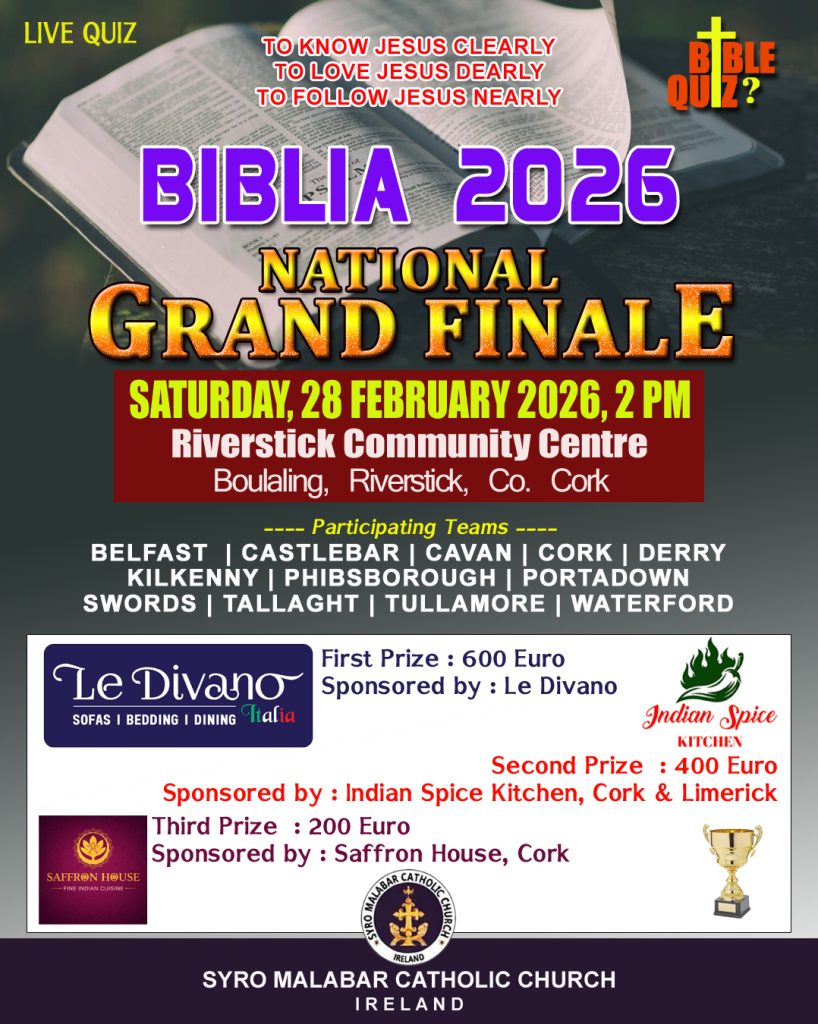 ഡബ്ലിൻ: **അയർലണ്ട് സീറോ മലബാർ സഭ**യുടെ കാറ്റിക്കിസം വിഭാഗം വർഷങ്ങളായി സംഘടിപ്പിച്ചുവരുന്ന ബൈബിൾ ക്വിസ് മത്സരമായ **‘ബിബ്ലിയ 2026’**യുടെ നാഷണൽ ഗ്രാൻഡ് ഫിനാലെ ഫെബ്രുവരി 28 (ശനിയാഴ്ച) നടക്കും.