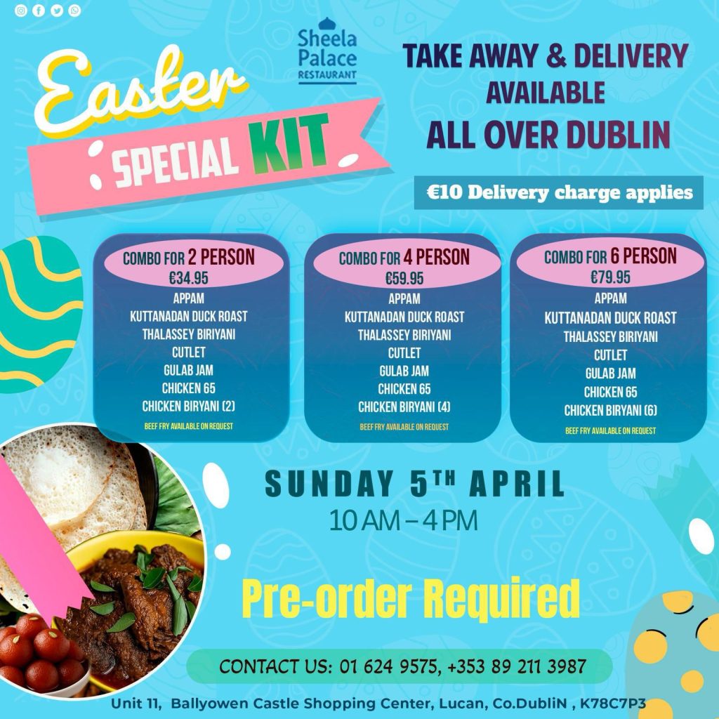 ഏപ്രിൽ 5 ഞായറാഴ്ച വമ്പൻ ഓഫറുമായി ഷീല പാലസ് റസ്റ്ററന്റിന്റെ ഈസ്റ്റർ സ്പെഷ്യൽ കിറ്റുകൾ. ഡബ്ലിനിൽ എവിടെയും ടേക്ക് എവേയും ഡെലിവറിയും ലഭ്യമാണ്. ഡെലിവറി ചാർജ് 10 യൂറോ.
