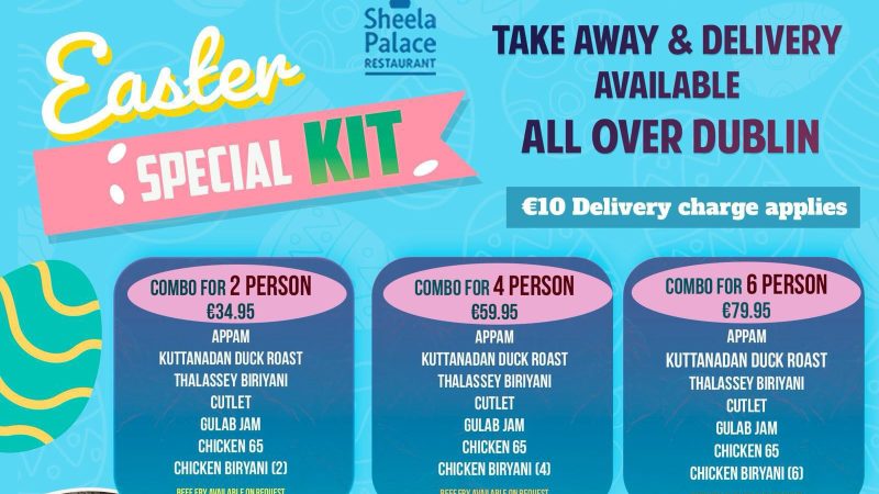 ഏപ്രിൽ 5 ഞായറാഴ്ച വമ്പൻ ഓഫറുമായി ഷീല പാലസ് റസ്റ്ററന്റിന്റെ ഈസ്റ്റർ സ്പെഷ്യൽ കിറ്റുകൾ. ഡബ്ലിനിൽ എവിടെയും ടേക്ക് എവേയും ഡെലിവറിയും ലഭ്യമാണ്. ഡെലിവറി ചാർജ് 10 യൂറോ.