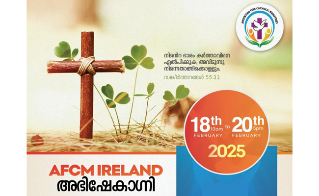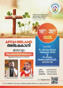 പ്രശസ്ത വചന പ്രഘോഷകനും Anointing Fire Catholic Ministries (AFCM) ന്റെ സ്ഥാപക ഡയറക്ടറുമായ റവ. ഫാ.സേവ്യർ ഖാൻ വട്ടായിലിന്റെയും ഫാ. ഷൈജു നടുവത്താനിയുടെയും (AFCM UK) നേതൃത്വത്തിൽ ‘അഭിഷേകാഗ്നി’ താമസിച്ചുള്ള ധ്യാനം അയർലണ്ടിൽ കൗണ്ടി ക്ലയറിലുള്ള St. Flannans College ൽ വച്ചു നടത്തപ്പെടന്നു. ഫെബ്രുവരി 18 ചൊവ്വ രാവിലെ 10.00AM ന് ആരംഭിച്ച് 20 വ്യാഴം വൈകുന്നേരം 04.00PM ന് സമാപിക്കുന്ന ധ്യാനം ക്രമീകരിച്ചിരിക്കുന്നത് അയർലണ്ടിലെ AFCM Team ആണ്.
