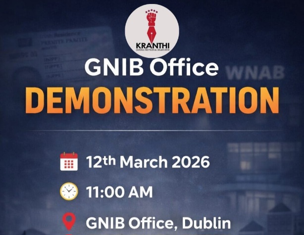 ഐആർപി (IRP) കാർഡുകൾ പുതുക്കുന്നതിലുണ്ടാകുന്ന അനാവശ്യമായ കാലതാമസത്തിനെതിരെ ക്രാന്തി അയർലണ്ട് ഡബ്ലിൻ ജി എൻ ഐ ബി ഓഫീസിനു മുന്നിൽ നടത്തുന്ന സമരം ഇന്ന്. ഐആർപി കാർഡ് പുതുക്കലിൽ ഉണ്ടാകുന്ന കാലതാമസം കുടിയേറ്റ സമൂഹത്തിനെ സാരമായി ബാധിക്കുന്ന അവസ്ഥയാണ്. നിരവധി ആളുകളുടെ ജോലിയെയും യാത്രകളെയും കുടുംബജീവിതത്തെയും സാരമായി ഇപ്പോൾ തന്നെ ബാധിച്ചു. ക്രാന്തി അയർലണ്ട് ഇതിനെതിരെ ശക്തമായ പ്രതിഷേധ സമരം സംഘടിപ്പിക്കുകയാണ്.