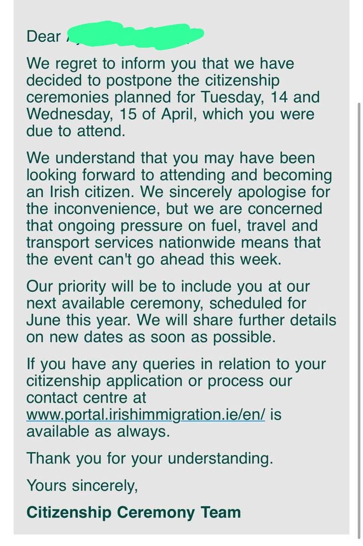 ഏപ്രിൽ 14 (ചൊവ്വ), 15 (ബുധൻ) തീയതികളിൽ കില്ലാർണിയിലെ ഐ.എൻ.ഇ.സി (INEC) ഹാളിൽ വെച്ച് നടക്കാനിരുന്ന പൗരത്വ സ്വീകരണ ചടങ്ങുകളാണ് അവസാന നിമിഷം മാറ്റിവെച്ചത്.