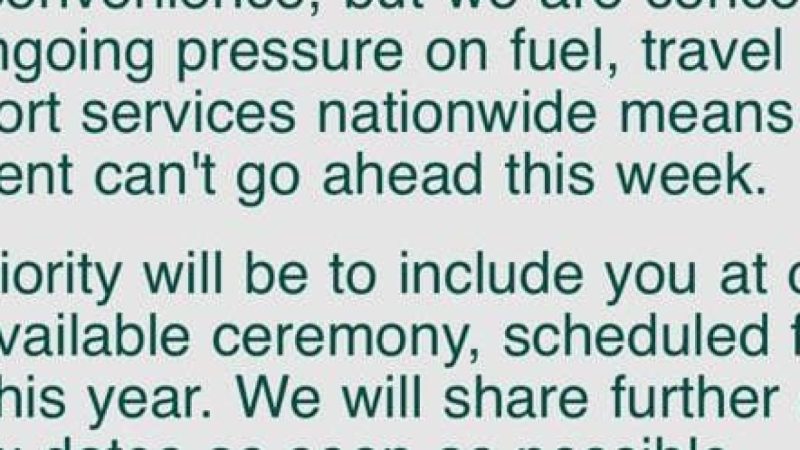 അയർലൻഡിൽ ഏപ്രിൽ 14, 15 തീയതികളിൽ നടക്കാനിരുന്ന പൗരത്വ ചടങ്ങുകൾ (Citizenship Ceremonies) മാറ്റിവെച്ചതായി അധികൃതർ അറിയിച്ചു. രാജ്യവ്യാപകമായി ഇന്ധന വിതരണം, യാത്ര, ഗതാഗതം എന്നിവ നേരിടുന്ന കടുത്ത സമ്മർദ്ദവും തടസ്സങ്ങളും കണക്കിലെടുത്താണ് ഈ തീരുമാനം.